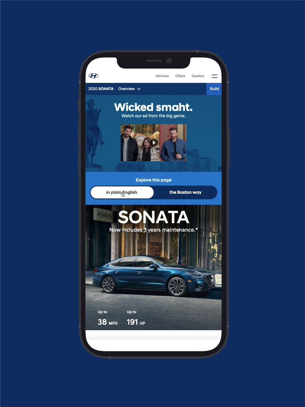 Using four of Boston's most beloved celebrities, John Krasinski, Chris Evans, Rachel Dratch and David "Big Papi" Ortiz, we leaned into the iconic Boston accent. And overnight, Smart Park became "Smaht Pahk." Through humor and witty dialogue, we got all of America actually having fun saying the name of the Sonata's feature. And the fun didn't stop there; it extended into social and even HyundaiUSA.com - where shoppers could learn about the 2020 Hyundai Sonata the "Boston way."